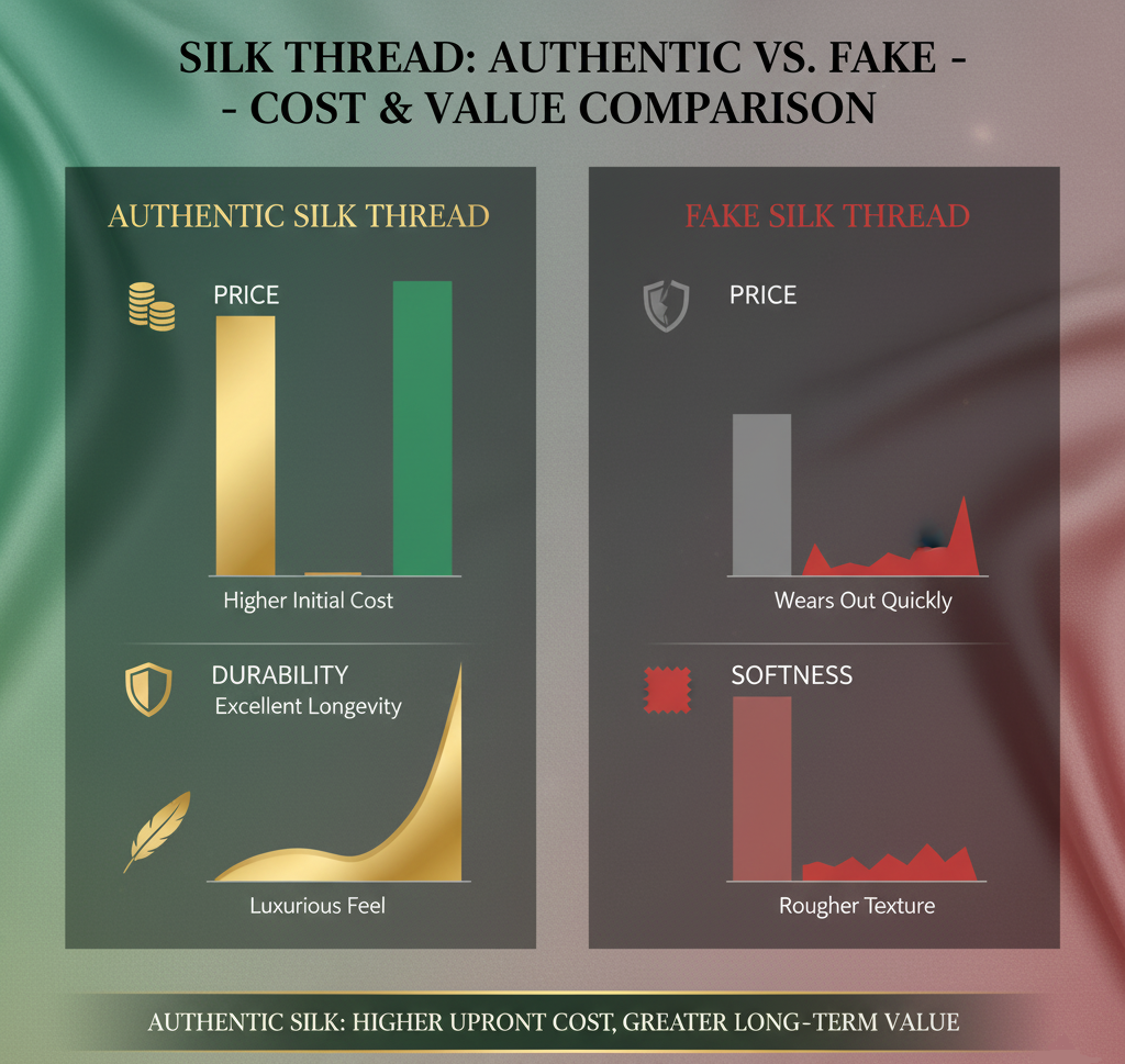 اگرچه نخ ابریشم اصل هزینه اولیه بیشتری دارد، اما دوام و کیفیت بالای آن باعث کاهش هزینه جایگزینی می شود. نخ تقلبی سریع تر ساییده می شود و ممکن است رنگ یا بافت خود را از دست دهد، بنابراین در بلندمدت هزینه بیشتری روی دست مصرف کننده می گذارد.